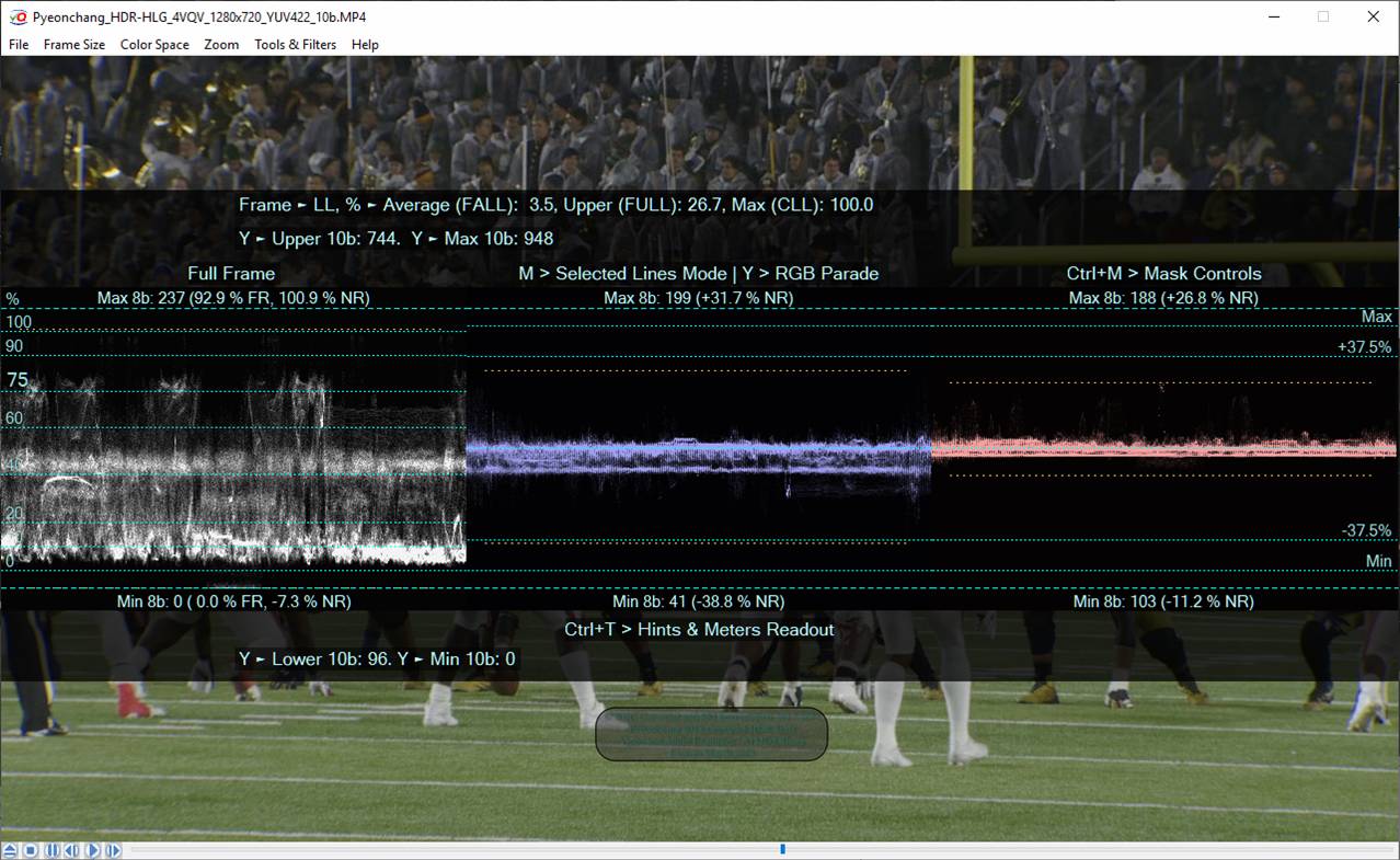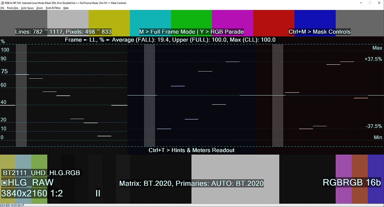 • 75% of HLG Data Range, Relative LL 20% and 10 bit value 721 (or 720 for 8 bit 180 x4),