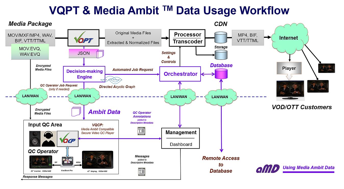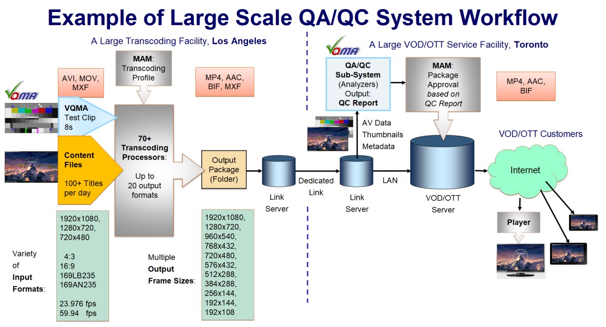 VQPT Modules run on premises or in the cloud and measure a media package in a variety of files formats at the workflow input point (for intake QC and transcoder settings optimization purposes), as well as at few more points, up to the workflow output (Output QC)