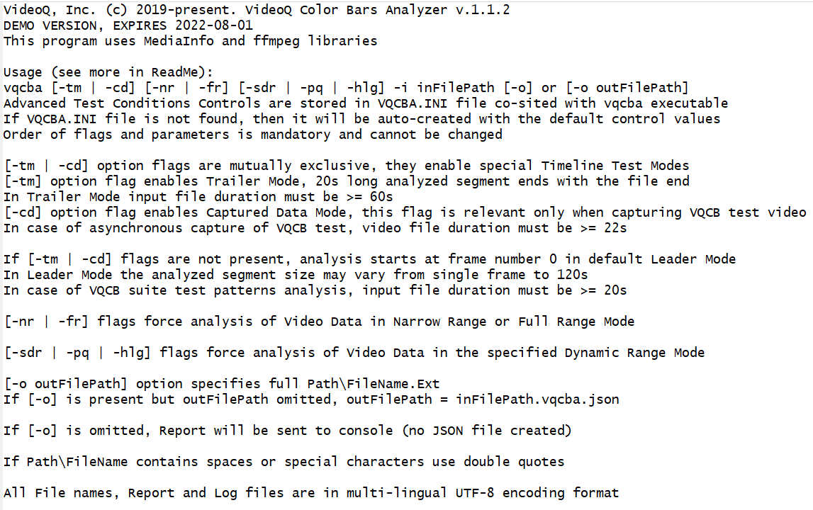 It reads media file YUV/RGB data, detects the relevant segments of video timeline, auto-detects test pattern type, calculates video and audio content parameters, compares them with file metadata and user-defined tolerances, checks the workflow distortions and conversion footprints,
