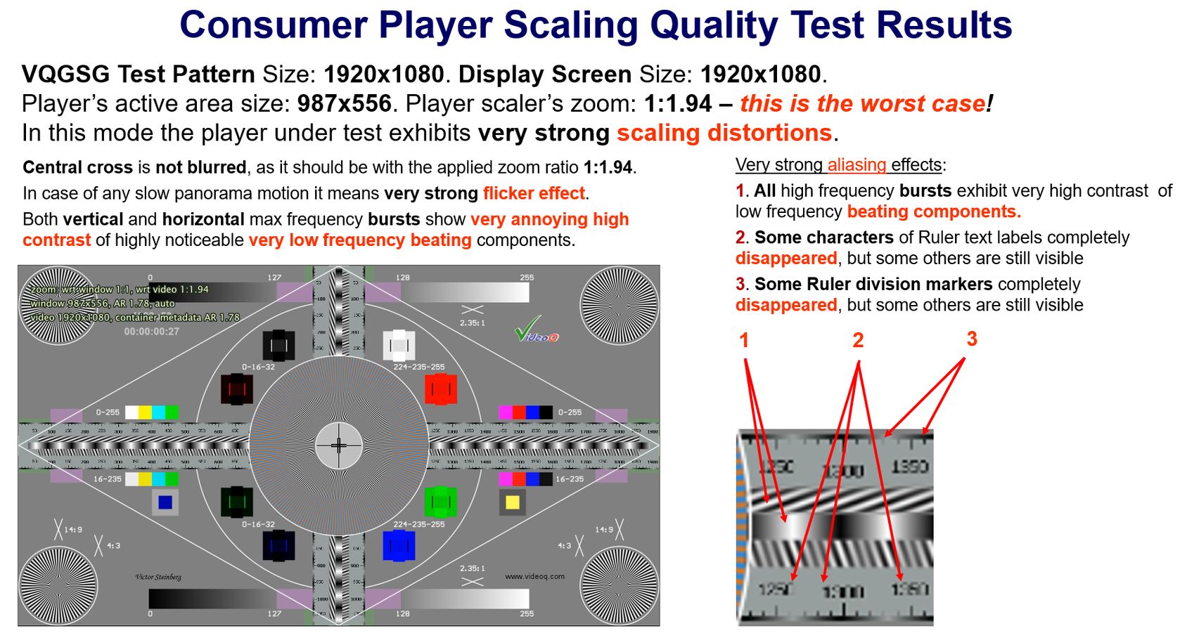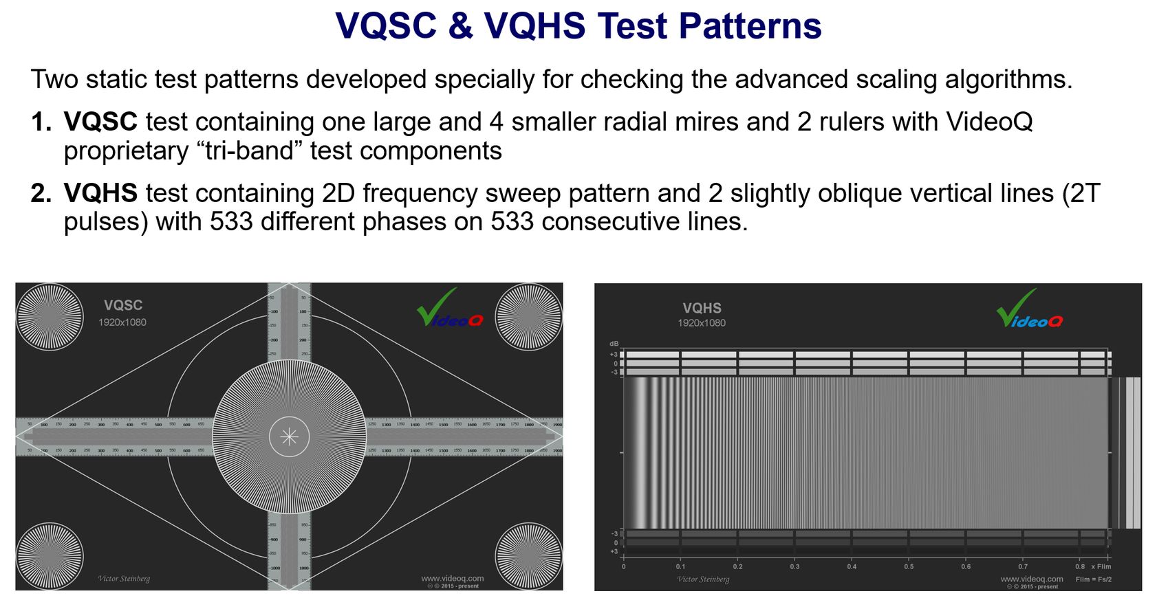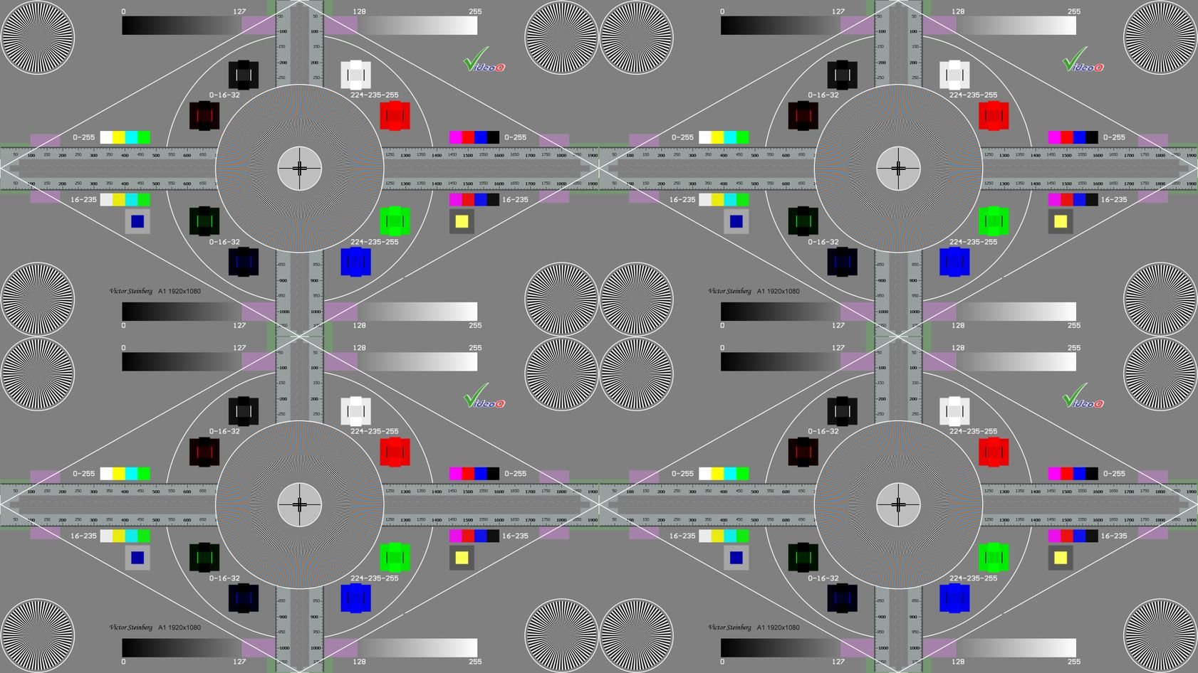 Two companion VQSC and VQHS test patterns contain full UHD and HD bandwidth test components. The tests are specially designed to check the advanced GPU adaptive scaling algorithms.