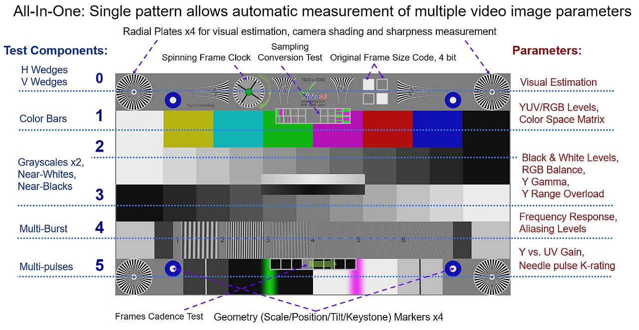 - Self-contained solution for manual or automated performance measurement of video cameras, video processors, video capture devices and/or complete video systems